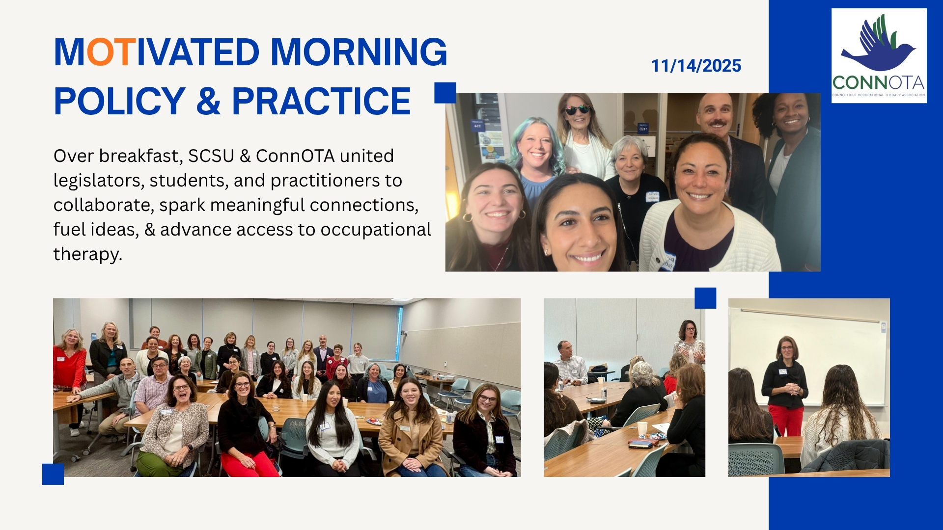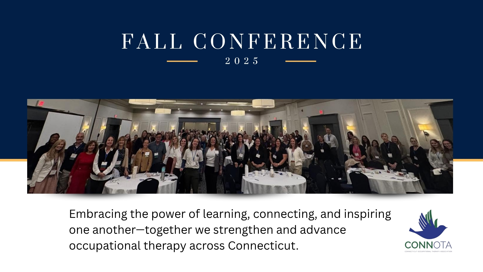 Our Gallery of ImpactCelebrating the Power of Occupational Therapy Across Connecticut Welcome to ConnOTA’s evolving Gallery of Impact—a visual tribute to the people, places, & possibilities that define occupational therapy in our state. These moments do more than showcase our profession—they demonstrate the power of being connected through ConnOTA. Each photo tells a story of how our members are shaping lives, strengthening communities, & advancing occupational therapy across settings. From the halls of the Capitol to classrooms, clinics, and community spaces, our members are not only practicing—they're leading, advocating, and supporting one another. This gallery captures those everyday moments where membership meets meaning, and where collective action fuels progress. When you’re part of ConnOTA, you’re part of something bigger. This is our story—told through the lens of shared purpose and lasting impact. Engaged & UnitedMoments from ConnOTA events, conferences, and collaborative partnerships statewide.